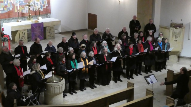 Mit rund 40 Sängerinnen und Sängern begeisterte unser Chor unter dem engagierten Dirigat unseres Chorleiters Robert Eller mit adventlichen Sätzen und bekannten in- und ausländischen Liedern zur Weihnacht. Das „O hehre Nacht“ von Adolph Ch. Adam sowie Felix Mendelssohns „Hark! The Herald Angels sing“ – überraschend in vier Sprachen gesungen – ragten daraus noch hervor.