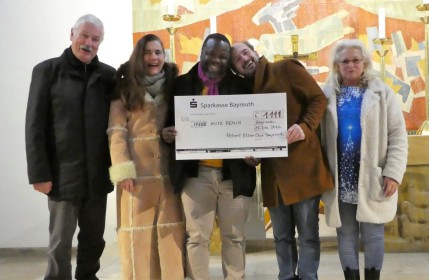 Das Foto zeigt bei der symbolischen Scheckübergabe rechts neben Ibukun Koussoumo Chorleiter Robert Eller, ferner (von links) den Chorsprecher Reinhard Wagner, Pfarrerin Annemarie Ritter und (ganz rechts) Lorette Purucker vom Chor.