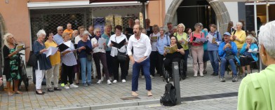 Mit Liedern wie „We Shall Overcome“, „Die Gedanken sind frei“ und „Oh, Happy Day“ setzte unser Chor in der Bayreuther Maximilianstraße einen Glanzpunkt zum Tag der Deutschen Einheit. Die Bayreuther Bürgerinnen und Bürger wurden damit auf das Wunder der Friedlichen Revolution und des Mauerfalls erinnert. Erfreulich viele nahmen – von Chorleiter Robert Eller gestenreich animiert – das Angebot wahr und stimmten frohgemut in die bekannten Weisen ein.